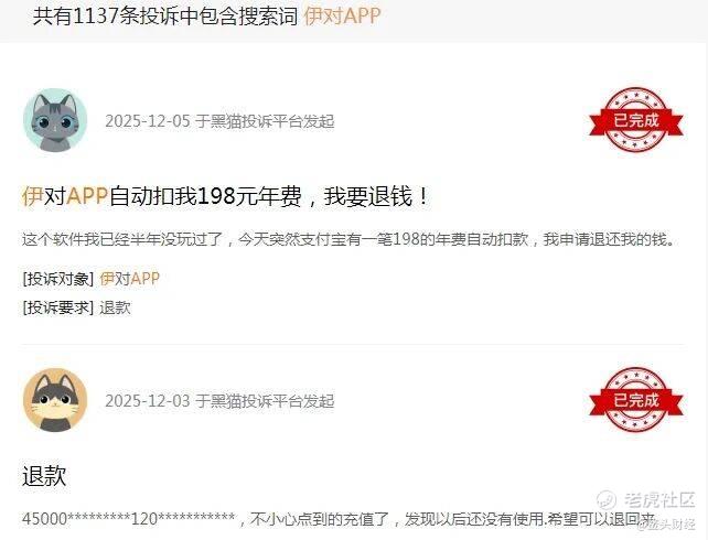 截至2025年底,黑猫投诉平台以“伊对APP”为关键词搜索,相关搜索多达1137条,问题主要聚焦在虚假宣传、诱导消费、自动扣费等方面。