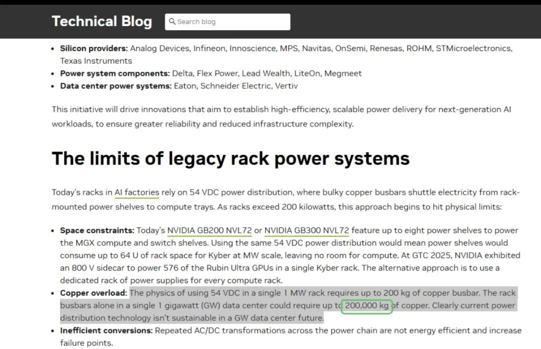 论文声称,传统架构中单个1MW机架需要200kg铜母线,而1GW机架则需要"50万吨"。按这个数字,仅数据中心领域就将消耗全球近半铜矿产量,市场一度陷入"铜末日"恐慌。