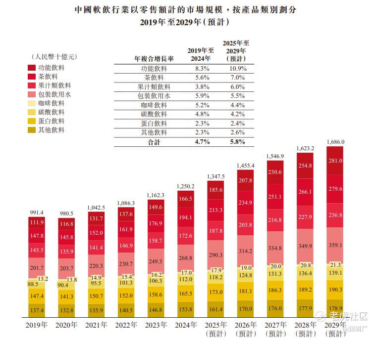 中国软饮行业市场:受居民人均可支配收入增长、品类延展、销售渠道细化及消费者健康意识增强等因素驱动,中国软饮市场持续增长,按零售额计,2019年至2024年年复合增长率为4.7%,预计2025年起将以5.8%的年复合增长率进一步增至2029年的人民币16,860亿元,其中功能饮料是行业内增长最快的细分品类;消费者健康意识的提升在扩大消费群体、增加消费频率方面发挥关键作用,饮料企业推出的低糖、低卡和零添加配方产品吸引了此前对健康关注度较低的人群,开拓了未被充分服务的细分市场,同时健身热潮带动了补水和营养补充需求增长,能量饮料及运动饮料等功能饮料已从偶尔消费转变为日常锻炼中的习惯性消费,显著提高了购买频率,进一步巩固了软饮在健康生活方式中的重要地位。