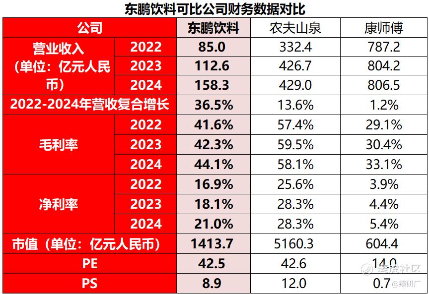 从估值上看,东鹏饮料当前市值为1413.7亿元,低于农夫山泉的5160.3亿元,但显著高于康师傅的604.4亿元;其PE值为42.5,与农夫山泉的42.6基本持平,远高于康师傅的14.0;PS值为8.9,低于农夫山泉的12.0,但远高于康师傅的0.7。市场给予东鹏饮料高PE、PS估值,核心支撑正是其营收持续高增长兑现的成长红利。农夫山泉依托更大的营收基数与多品类稳健布局,获得了成熟龙头的估值溢价;康师傅则因营收增速放缓,呈现成熟型企业的低估值特征。随着东鹏饮料多品类布局,如电解质水“补水啦”持续推进,叠加全球化战略落地,其市值具备进一步向上突破的潜力。