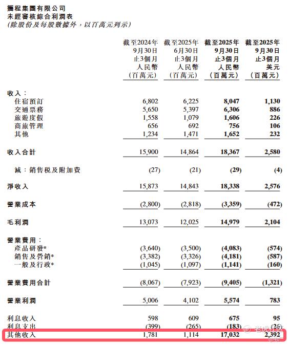 但需要注意的是,期间携程出售了印度在线旅游平台MakeMyTrip的部分股权,使财报中的“其他收入”一举超过170亿元。作为对比,携程上一季度和2024年同期的“其他收入”分别只有11.1亿元和17.8亿元。剔除这笔非经营性的一次性收益,营业利润的数字是55.7亿元,还谈不上所谓的“日赚超过2亿”。