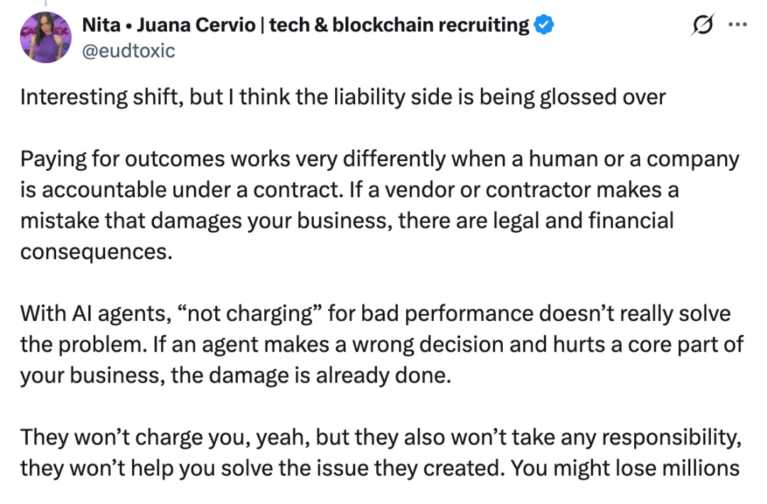 正如X平台上一位从业者所言:“按结果付费是个有趣的转变,但我认为责任一方的处理过于轻描淡写。如果供应商的错误损害了你的业务,法律和财务后果不会因此消失。如果表现很差,AI agent就不收费,但这也不解决他们带来的麻烦。你可能要为此损失数百万美元。”