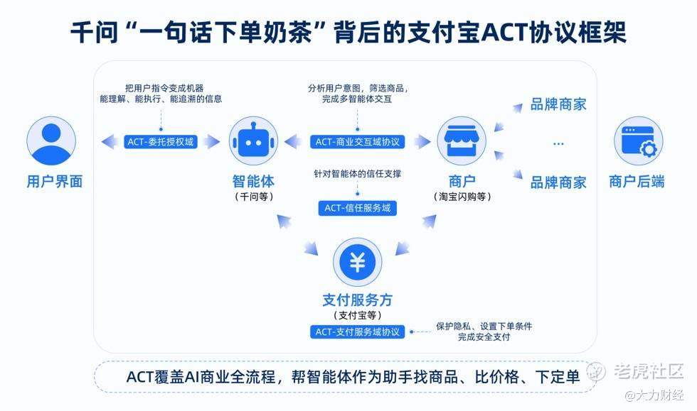 ACT 协议的诞生正是为破解这些问题而来。支付宝为其搭建了 “委托授权域”“商业交互域”“支付服务域”“信任服务域” 四大核心基础设施标准,实现 AI 操作全流程可追溯、可验证,让人更放心;支持自动化交易流程,减少不必要的人工干预,提升服务效率;统一多平台服务标准,避免体验的割裂。