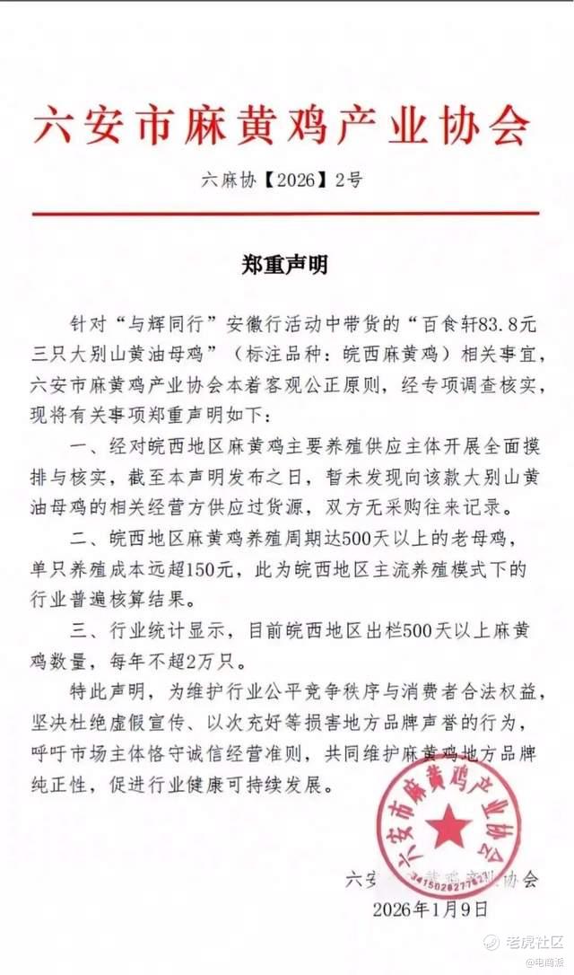 再说回那条视频,里面展示了一则安徽省六安市麻黄鸡产业协会发布的声明,主要罗列了三点试图说明与辉同行的问题。