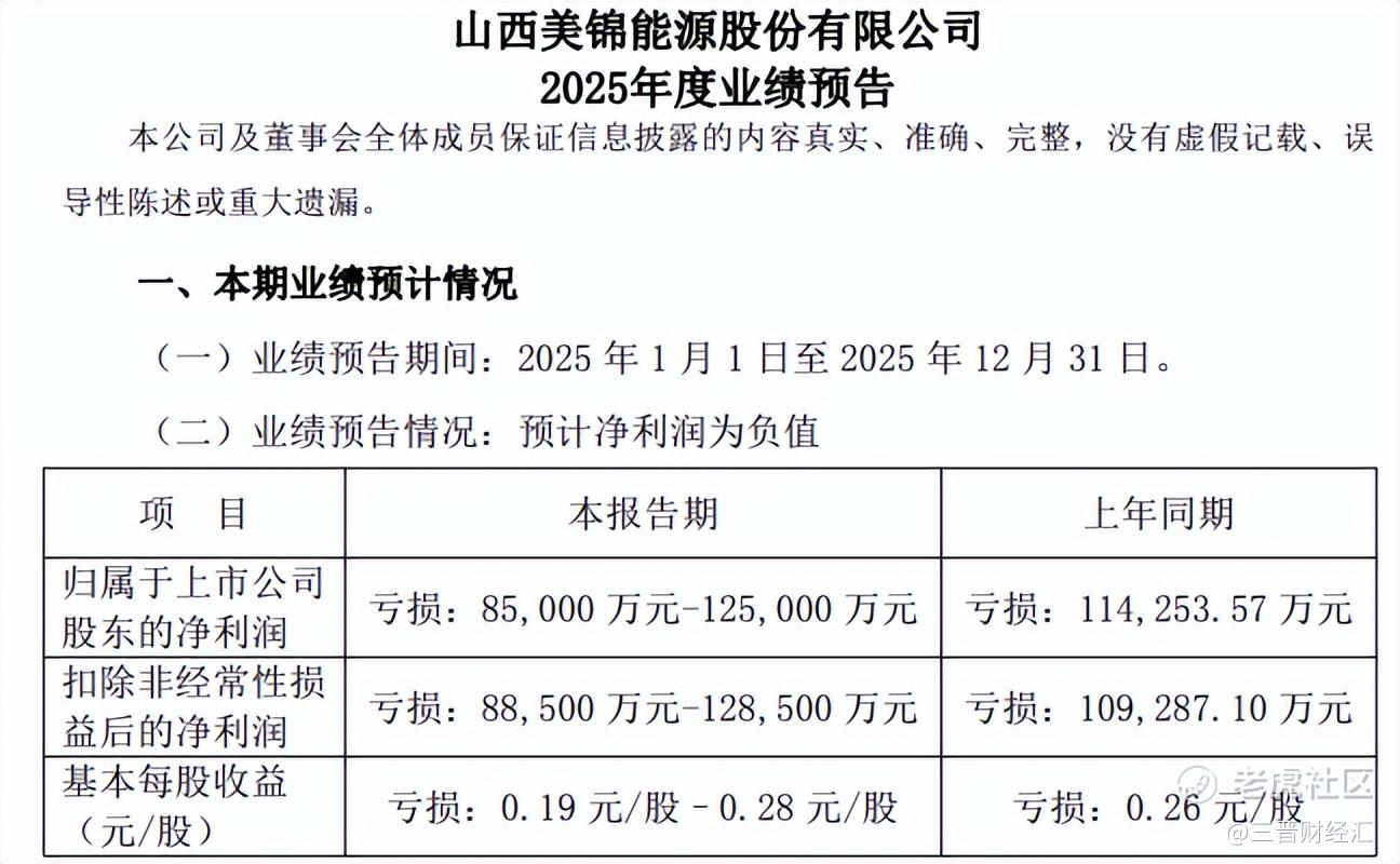 1月15日,山西A股上市公司美锦能源(000723.SZ)发布2025年业绩预告,公司全年实现归母净利润预计亏损8.5亿元至12.5亿元,扣非净利润预计亏损8.85亿元至12.85亿元。