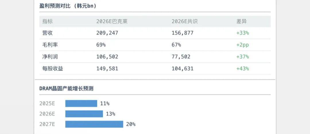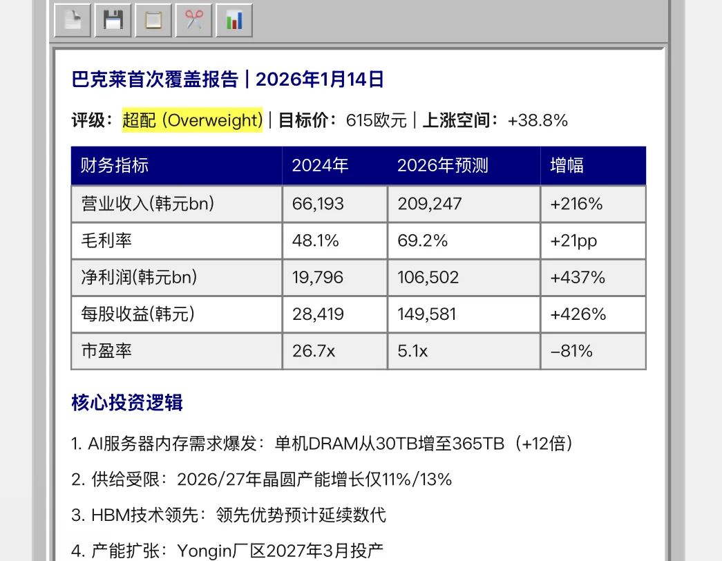 数据层面相当激进。巴克莱预测SK hynix 2026年收入将达到2092亿韩元,较2024年的662亿韩元增长超过三倍。