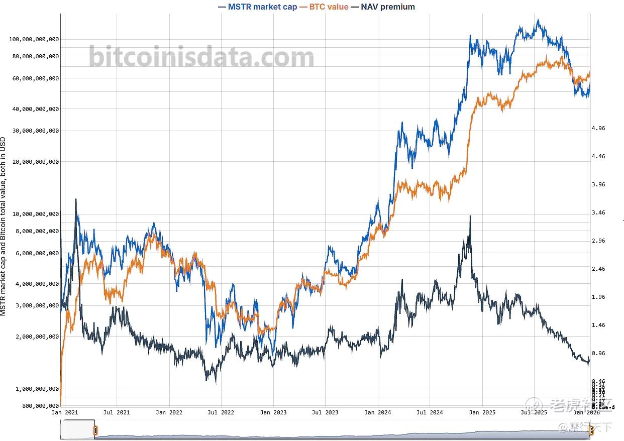 - 当黑色线在0以下,说明MSTR的市值比它持有的比特币总价值更低,出现了“折价”。