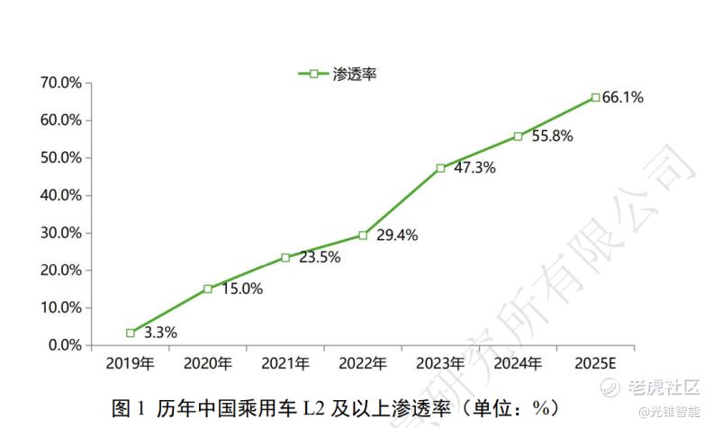 根据《报告》显示,中国乘用车L2及以上的智驾渗透率从2019年的3.3%,一路攀升至2025年(预计)的66.1%。从新品发布的层面看,现在中国车企发布十来万的车型,要是没有高速NOA+城区记忆领航+泊车,那简直还有点“丢人”。