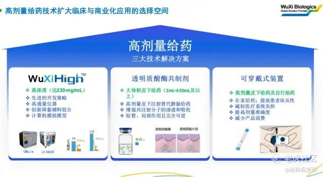 在制剂一端,药明生物有着WuXiHigh™ 2.0平台,这其中藏着药明生物“拿捏”高浓度生物制剂的奥秘。高浓度生物制剂通常指蛋白浓度超过100mg/mL的制剂,具有减少注射量、提升给药效率及提升患者依从性等优势,正日益成为制药企业研发的关键方向。目前,美国食品药品监督管理局(FDA)批准的单抗产品中,有超过20%属于高浓度制剂。然而,高浓度制剂的开发和生产过程仍面临诸多技术挑战,如高粘度和易形成蛋白聚体等问题,增加生产工艺开发的复杂度、降低药品稳定性并增加免疫原性风险。目前FDA已批准的生物制剂最高浓度为200mg/mL,而WuXiHigh™2.0平台依托药明生物专有的辅料配方组合及新一代技术,将蛋白浓度提升至230mg/mL。这一突破不仅显著增强了给药灵活性,降低注射频次,还简化了冷链物流需求,全面提升原液和制剂生产的效率。WuXiHigh™2.0平台独创24种专属辅料组合,最高可将粘度降低90%,同时保障配方稳定性与注射舒适度。