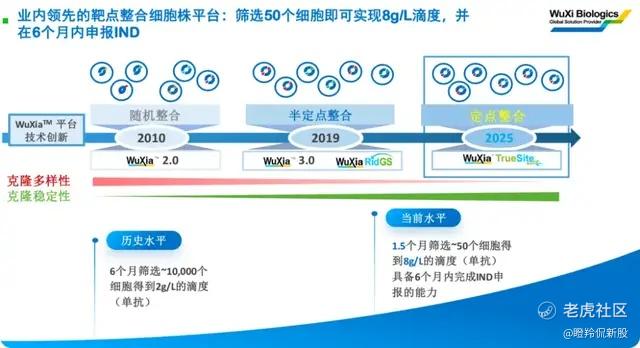 在开发源头上,药明生物有着WuXia™ TrueSite平台,该平台是WuXia™平台的4.0模式,通过技术创新进一步大幅提升开发效率和质量,可实现单克隆抗体平均表达量超8.0克/升,为商业化生产的高产量需求提供支撑。与此同时,WuXia™ TrueSite能显著提升细胞池与细胞克隆质量的一致性,并且超99%的克隆细胞在传60代次后仍保持稳定的蛋白表达,可降低20000升以上规模放大生产中表达量下降的风险。过优化工艺开发流程,WuXia™ TrueSite能赋能客户实现6个月IND准备周期,为极具创新的治疗药物开辟驶入临床研发的快车道。