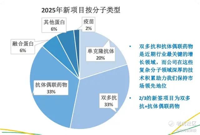 先从比较大的视角去看:药明生物目前项目总数为945个,而其中的first in class分子就占到了369个,占比达到39%。从2025年新增项目来看,药明生物在2025年新签209个项目,其中大部分药物是目前具有高开发价值,踩在行业风口上的大分子,例如,其中三分之二的药物为双/多抗及ADC药物。