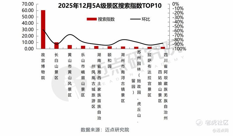 12月整体5A级景区品牌搜索指数均值为1.15,环比下滑约72%;TOP100 5A级景区品牌搜索指数均值为1.99,环比下降约80%;旅游淡季,游客出游计划减少,对景区的搜索量随之骤减。本月,5A级景区中搜索热度前十的分别是:故宫博物院、长白山景区、黄山市黄山风景区、乐山市峨眉山景区、湖南省湘西土家族苗族自治州凤凰古城旅游区、颐和园、湖州市南浔古镇景区、苏州园林(拙政园、虎丘山、留园)、拉萨布达拉宫景区、四川省阿坝藏族羌族自治州四姑娘山景区。上述各景区的搜索指数环比均有下滑,其中故宫博物院的降幅最小,12月故宫博物院养心殿重新开放、与火山引擎联合推出的“听宝贝说”AI互动播客、“来!听色彩讲故事”教育体验展开幕等,这些多元化的文化创新与体验升级举措一定程度上对冲了行业整体搜索热度的下行压力,成为故宫博物院维持用户关注度、实现搜索指数相对稳健表现的核心支撑。