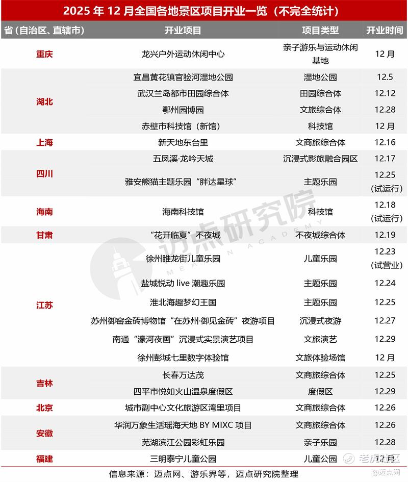 据迈点研究院不完全统计,12月新开业文旅景区项目22个,覆盖重庆、湖北、上海、四川、江苏等多省份,区域遍及东中西部各地区;项目类型丰富,涵盖运动休闲基地、湿地公园、文旅/文商旅综合体、主题乐园、沉浸式体验、科技馆等,其中文商旅综合体(如上海新天地东台里、长春万达茂、北京通州湾里)和主题乐园(如雅安“胖达星球”、淮北海趣梦幻王国)类项目较集中。这些新开业项目补充了淡季文旅供给,既能匹配本地家庭、年轻客群等不同群体的出游需求,也能依托优惠政策进一步激活淡季客流,丰富消费场景并带动文旅产业链消费。