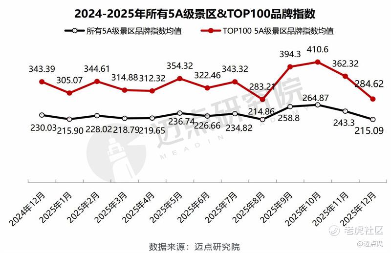 经迈点研究院监测,12月所有5A级景区的品牌指数均值为215.09,环比下降11.59%;100强5A级景区MBI品牌指数均值为284.62,环比下降约21%。12月处于传统的旅游淡季,游客出行意愿有所回落,叠加部分景区进入冬季运营调整期,品牌曝光与游客互动频次减少,使得5A级景区品牌指数呈现明显下滑,符合行业发展的周期性规律。