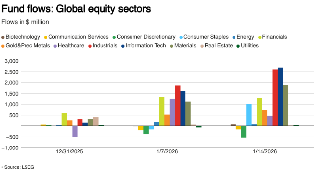 科技、工业以及金属和矿业板块尤其受到青睐,这些板块的周净流入资金分别为 26.9 亿美元、26.1 亿美元和 18.8 亿美元。
