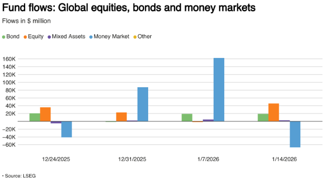 截至 1 月 14 日当周,全球股票基金录得 15 周以来最大的单周净买入额,投资者推动全球股市逼近历史高位,延续了去年的上涨势头,并暂时忽略了对全球经济和地缘政治的担忧。