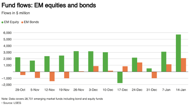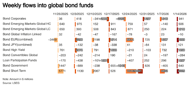 新兴市场资产受到追捧,投资者向新兴市场股票基金注入 57.3 亿美元,创下自 2024 年 10 月以来的单周最高纪录,同时净买入 20.9 亿美元的债券基金。以上数据涵盖了 28701 只基金。