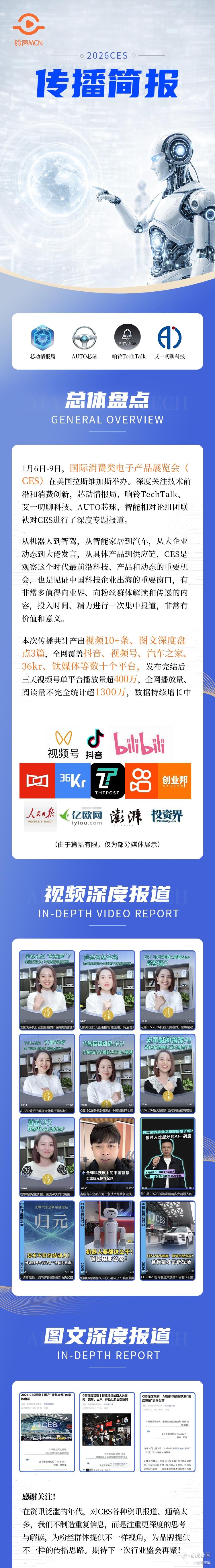 1月6日-9日,国际消费类电子产品展览会(CES)在美国拉斯维加斯举办。铃声MCN旗下深度关注技术前沿和消费创新的多个IP#智能相对论#艾一叨聊科技#芯动情报局#响铃TechTalk#AUTO芯球 组团联袂对CES 2026进行了全方位的深度专题报道,展现了深度的内容能力和广泛的传播力!