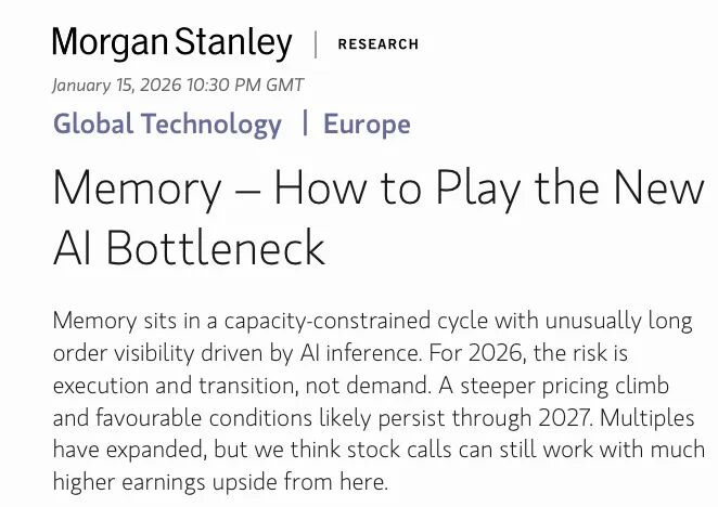 DRAM首选Samsung、SK hynix、Micron;legacy memory看Winbond;HDD押WDC和Seagate;设备端重仓ASML。他们认为这轮周期的peak还远未到来——YoY pricing还在加速、库存还在下滑、capex还没大规模上调。三个见顶信号一个都没出现,2026年的关键词或许不再是GPU,而是memory... 完整版已上传。