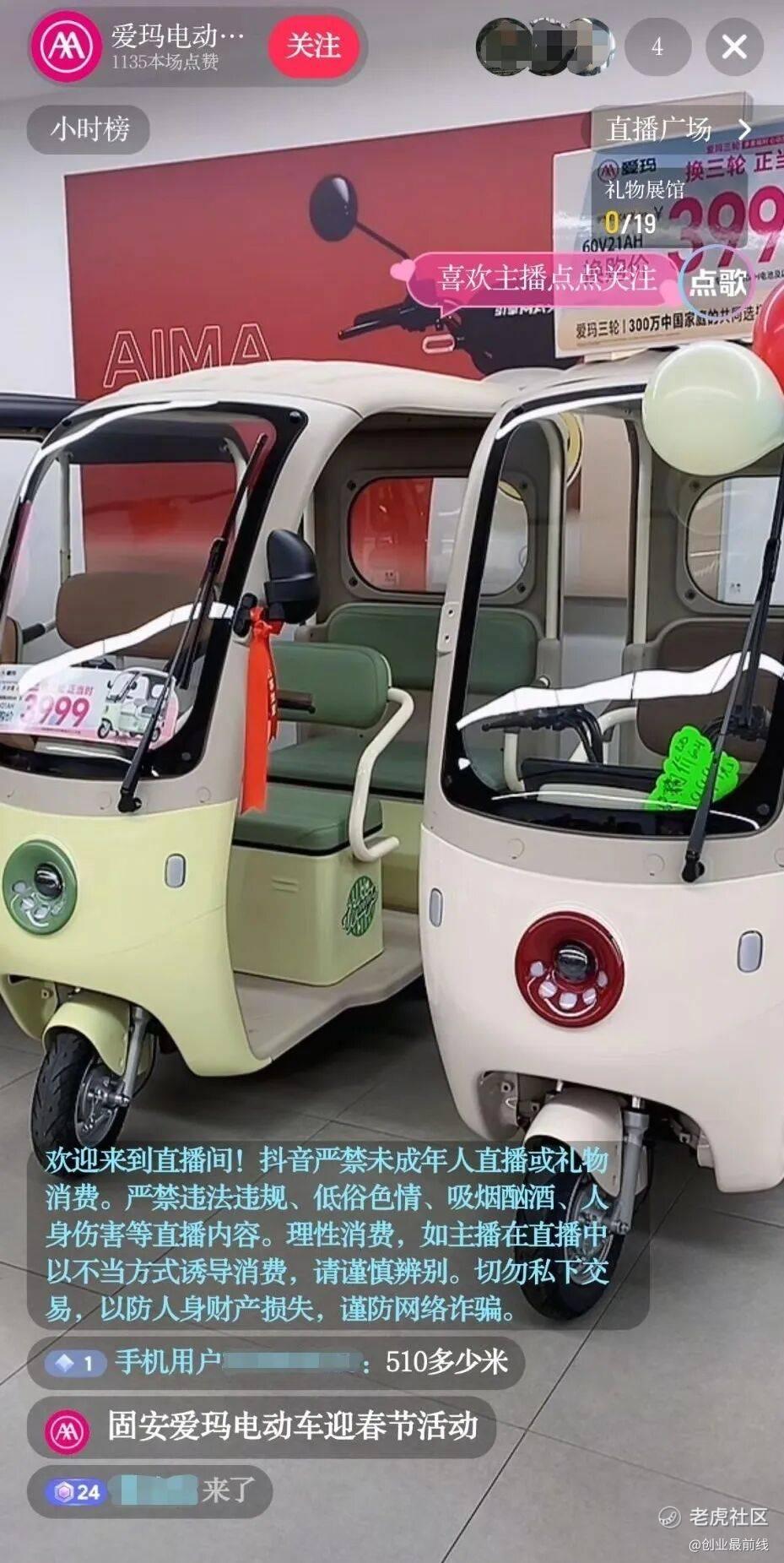 不同于车企直播间内的俊男靓女风,爱玛的直播间则相对朴实:一位销售员正在卖力地介绍店内的两轮以及三轮电动车,销售员言语卖力,语速也相当快。