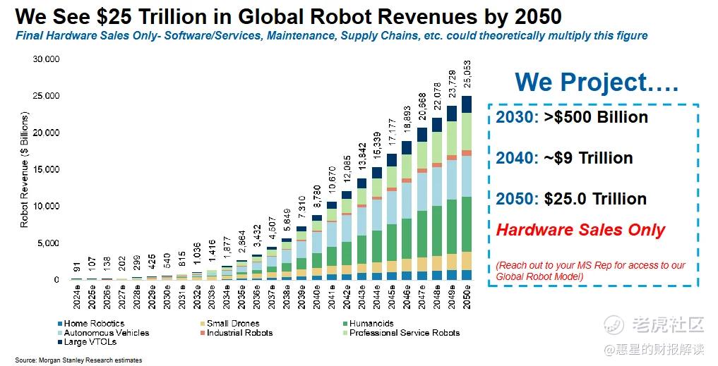 我查了下行业机构的预测,数据挺惊人的。全球机器人硬件销售额大概会从2025年的1000亿美元左右,一直激增到2050年的25万亿美元,销量也会从从2400万台增至14亿台。