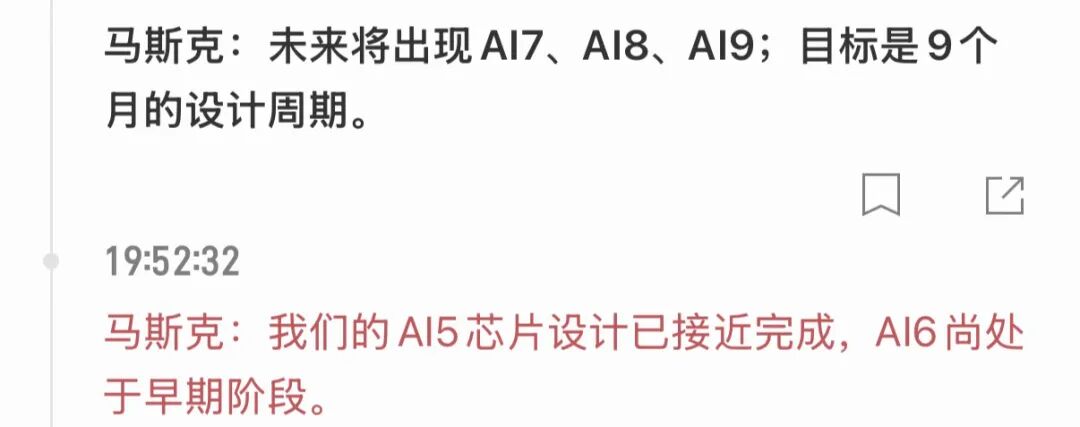 现在马斯克宣布,Tesla的AI芯片设计周期将压缩至9个月一代,AI5设计接近完成,AI6已启动,AI7、AI8、AI9的路线图已经排定。