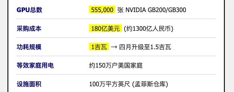 Colossus 2的规模令人窒息:555,000张NVIDIA GB200/GB300 GPU,采购成本约180亿美元,部署在田纳西州孟菲斯一座百万平方英尺的仓库中。