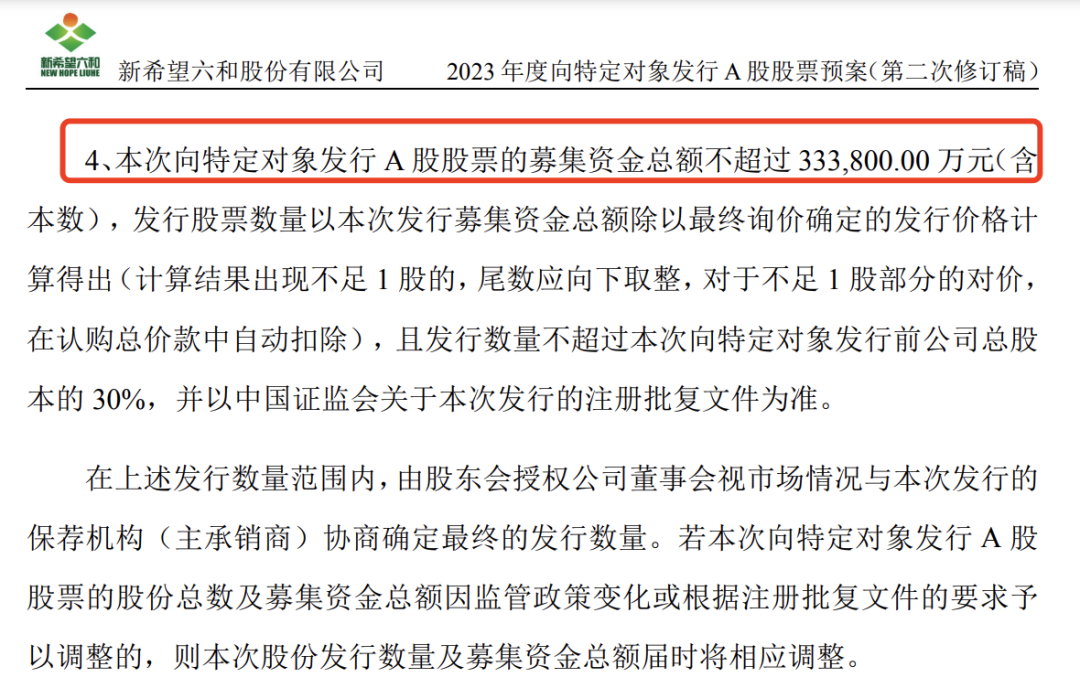 回顾此次定增项目的推进历程,2023年11月,新希望首次披露定增预案,拟募资不超过73.50亿元用于生猪养殖等项目。时隔两年,新希望对募资规模进行大幅调整,缩减幅度超过54%。