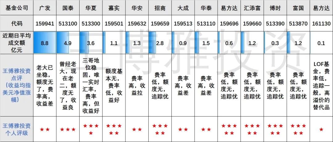 (10)汇添富159660⭐⭐⭐⭐⭐:费率很的纳指ETF,没有犯过错,而且表现一直好。管理水平值得信赖。