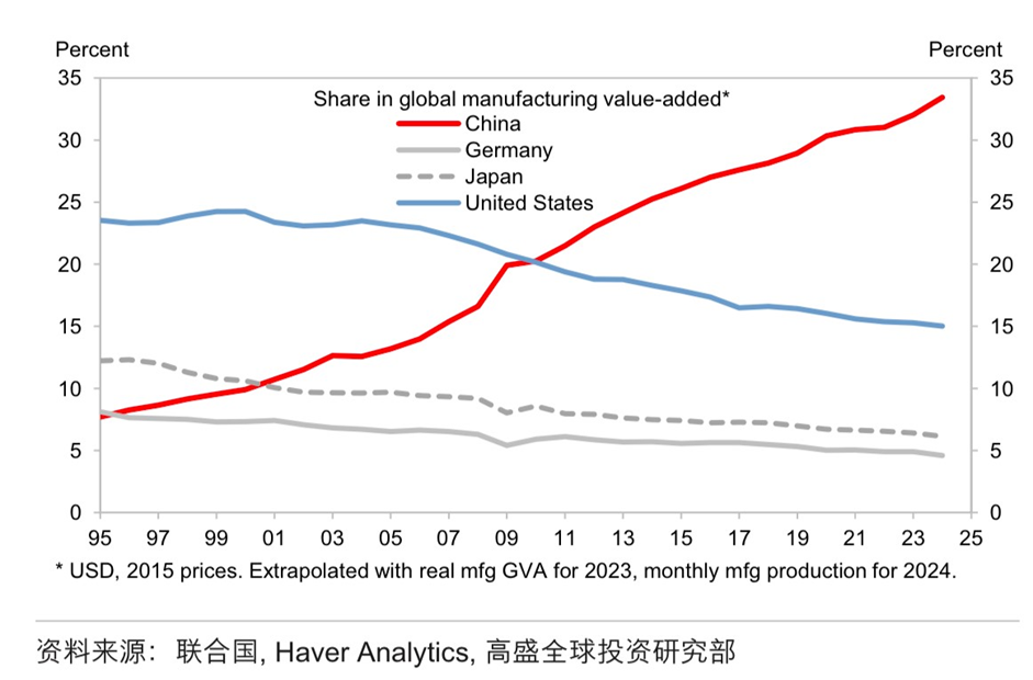 高盛观察到,中国人口占全球17%多一点,但中国制造业的增加值已经占全球三分之一,且这一占比每年还在上升;虽然中国制造业增加值占本国GDP的比重是下降的,从20年前的32%降至如今的25%左右。这就容易导致误判:要稳住制造业增加值占GDP的比重,意味着中国占全球制造业的比重会继续攀升,结果呢,我国产能过剩的问题就会越来越严重。