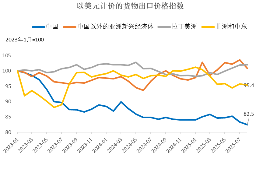 然而,靠扩大出口仍然从根本上扭转PPI走弱的趋势。因为我国出口占全球的份额不断上升,2014年的时候突破10%,2024年则逼近15%,2025年在美国对中国出口商品加征关税的背景下,出口依然保持较高增速。但仔细观察中国出口价格指数,发现从2022年末至2025年末这三年下跌了17.5%左右,跌幅远超其他发展中国家。