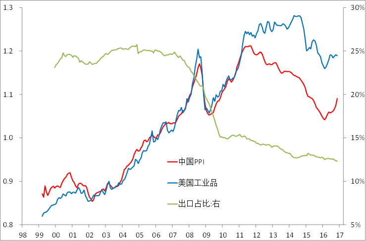 加入世贸后,中国的PPI与美国PPI(制造业品口径)完全接轨,但2012年后却出现了分叉。从全球景气的下行的角度并不能解释中国PPI所出现的更为明显的回落,因为中国经济增速远超全球平均水平。