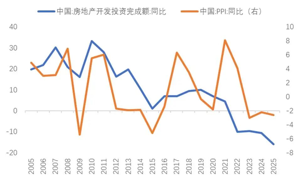 从下图中不难发现,房地产投资与PPI存在一定关联。比如,2009年年初的房地产投资回稳,2009年年中PPI增速触底;2016年棚改货币化安置带动PPI明显回升;疫情后的房地产投资下行也伴随着本轮PPI持续低迷。到了2025年末,房地产开发投资增速跌至-15%左右。