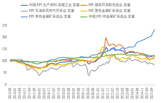 上游采掘业价格主要受煤炭、石油等价格波动影响。比如,2021年10月,受限产影响,蒙西焦煤价格指数、进口3800动力煤价格指数升至高点,当月,煤炭开采和洗选业PPI定基指数触及198.4。