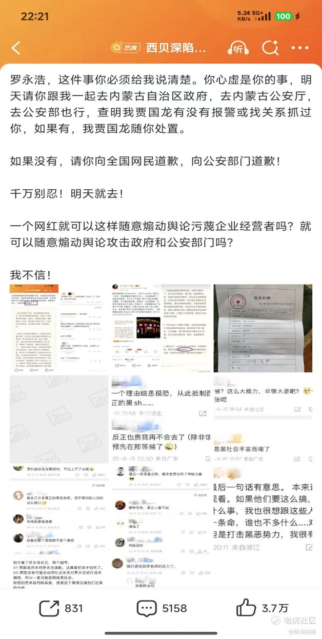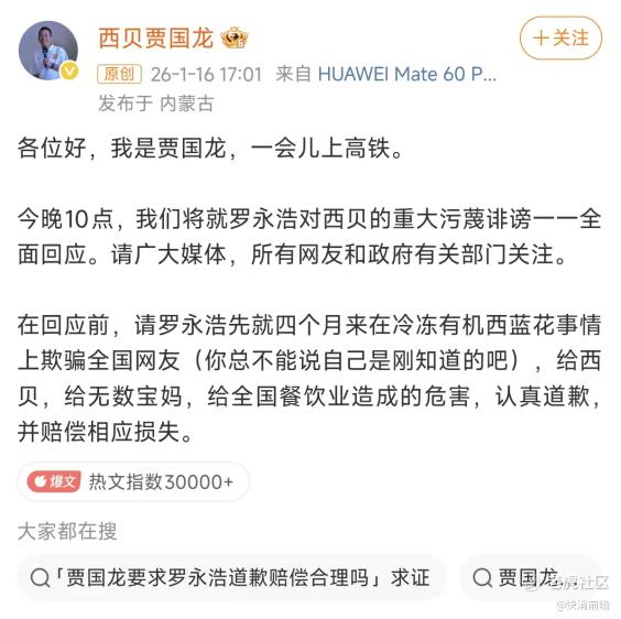文末,贾国龙向罗永浩发出公开邀约:“明天请你跟我一起去内蒙古自治区政府,去内蒙古公安厅,去公安部也行,查明我贾国龙有没有报警或找关系抓过你,如果有,我贾国龙随你处置。”同时提出明确诉求,若查明无此事,罗永浩需向全国网民、向公安部门道歉。“千万别忍!明天就去!”这句呐喊,尽显其破釜沉舟的态度。他最后发出灵魂拷问:“一个网红就可以这样随意煽动舆论污蔑企业经营者吗?就可以随意煽动舆论攻击政府和公安部门吗?我不信!”