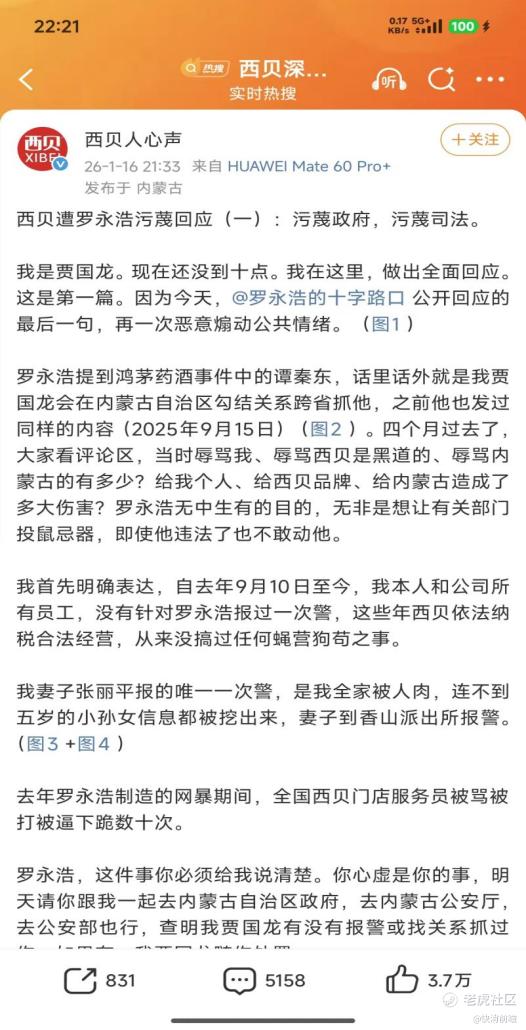 2026年1月16日晚间,尚未到约定的十点,西贝餐饮创始人贾国龙便打破此前约定的时间节点,通过微博账号“西贝人心声”发布重磅回应,标题直指“西贝遭罗永浩污蔑回应(一):污蔑政府,污蔑司法”,将这场横跨四个月的恩怨推向白热化。
