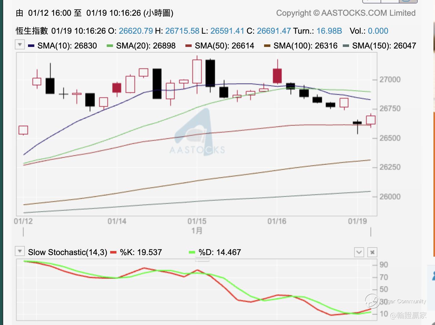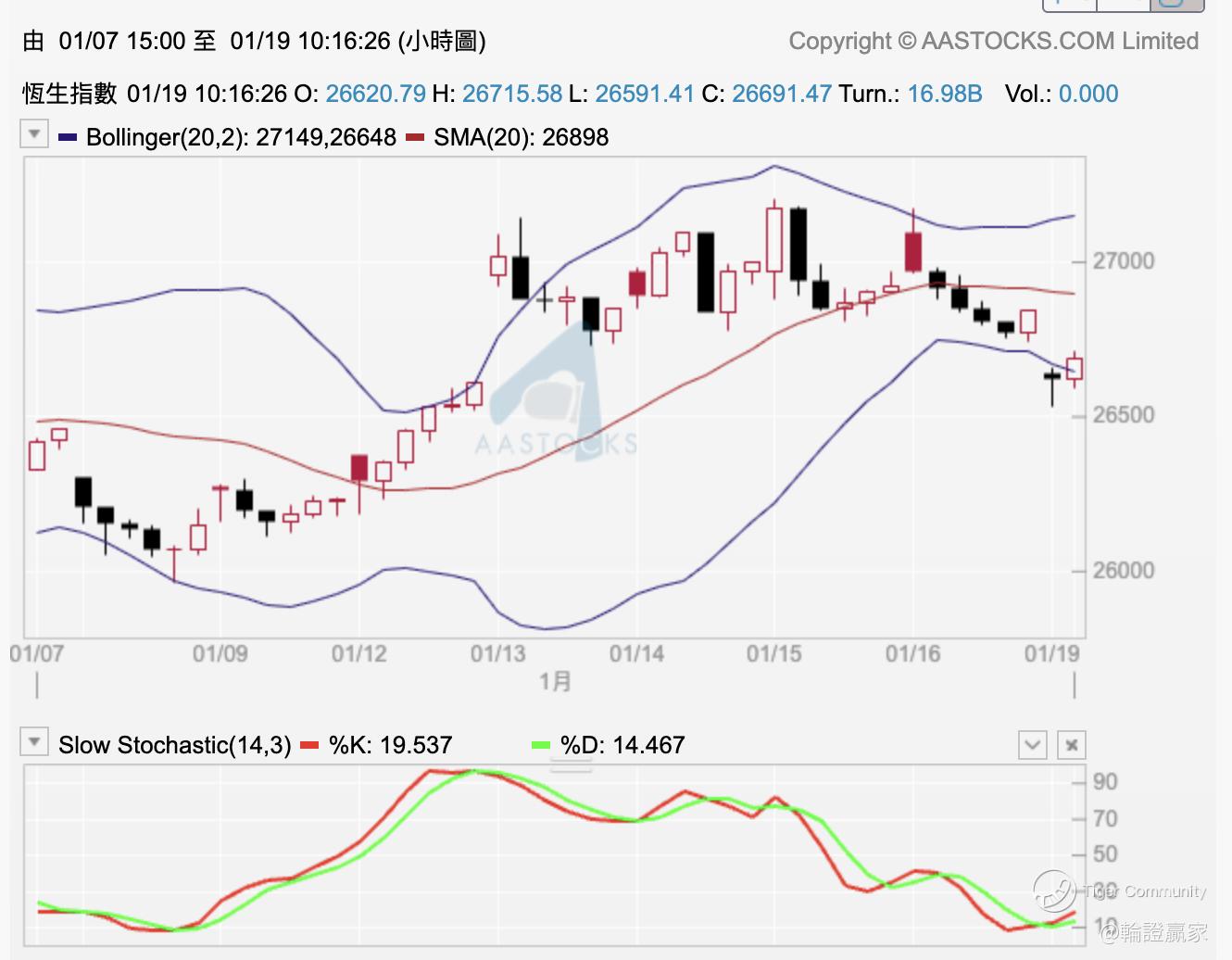 上个星期五拣定咗只好仓出嚟,谂住出文后会见到 $HSI(HSI)$ 差唔多落到小时图10/20线先到支持啦,谁不知无支持不得止,连喺五分钟图Slow STC(14.3)揾个位出嚟做触底嘅Swing,等到下半场开市之后都没有,叠埋心水等收市;不过作战室系有淡仓开出,借五分钟图10线同保历加底线夹住指数向下,直至到指数上破10线为止。
