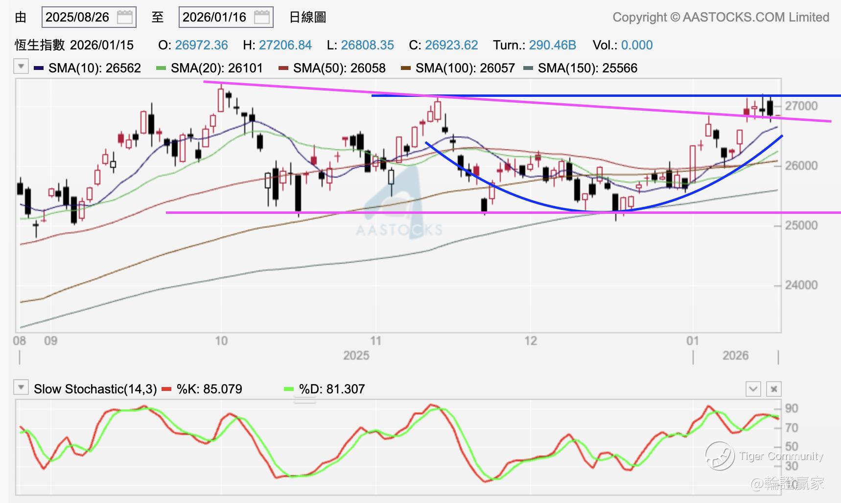 睇返日线图,已经连续四日指数上到27000点楼上但系收市计都系要碌返落去27000点楼下,由原先嘅「楔形」变成「圆底」上到颈线遇阻嘅形态,依家9点19分见期货跌紧200几点,已经Mark定日线图嘅10/20线。