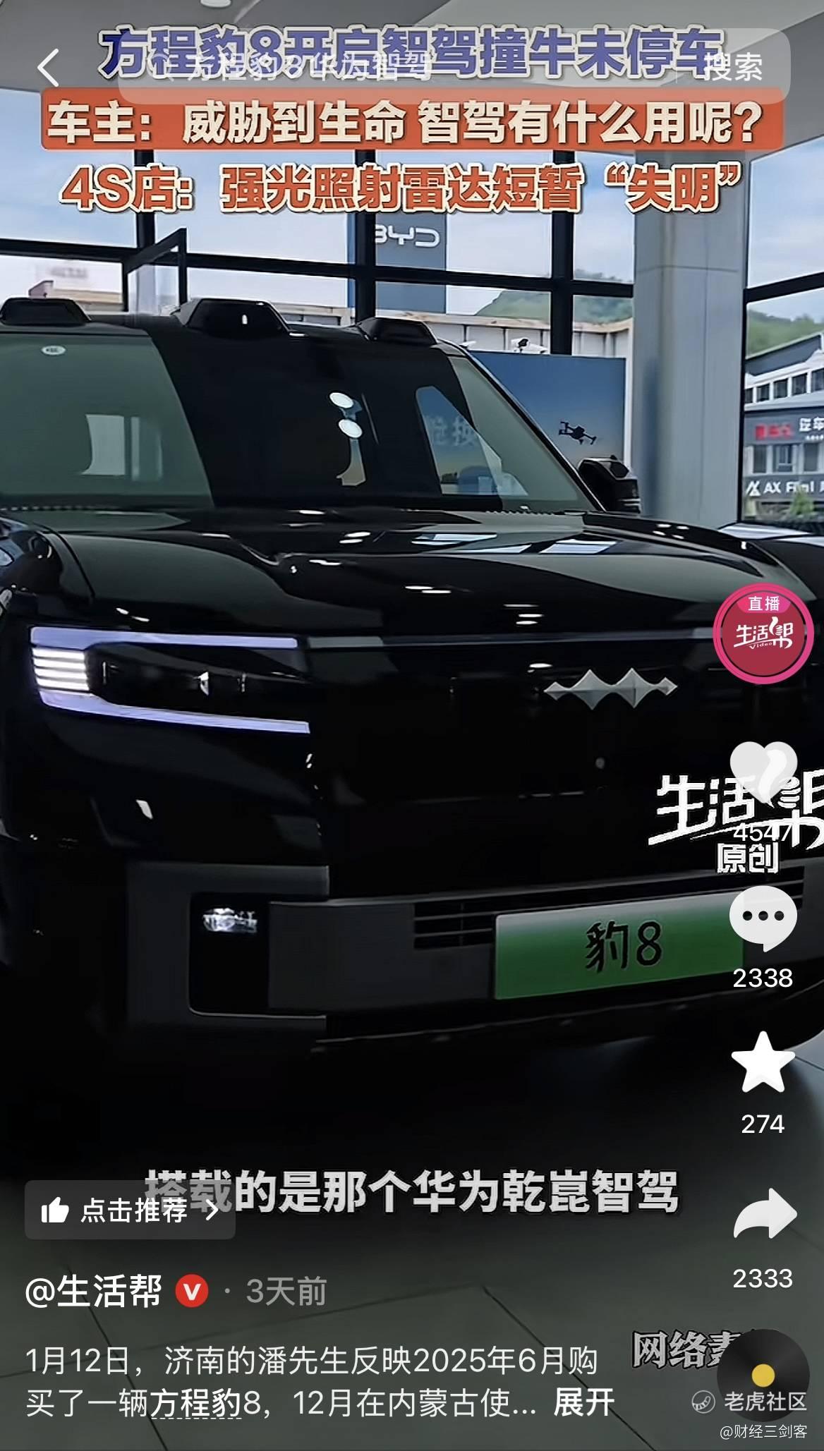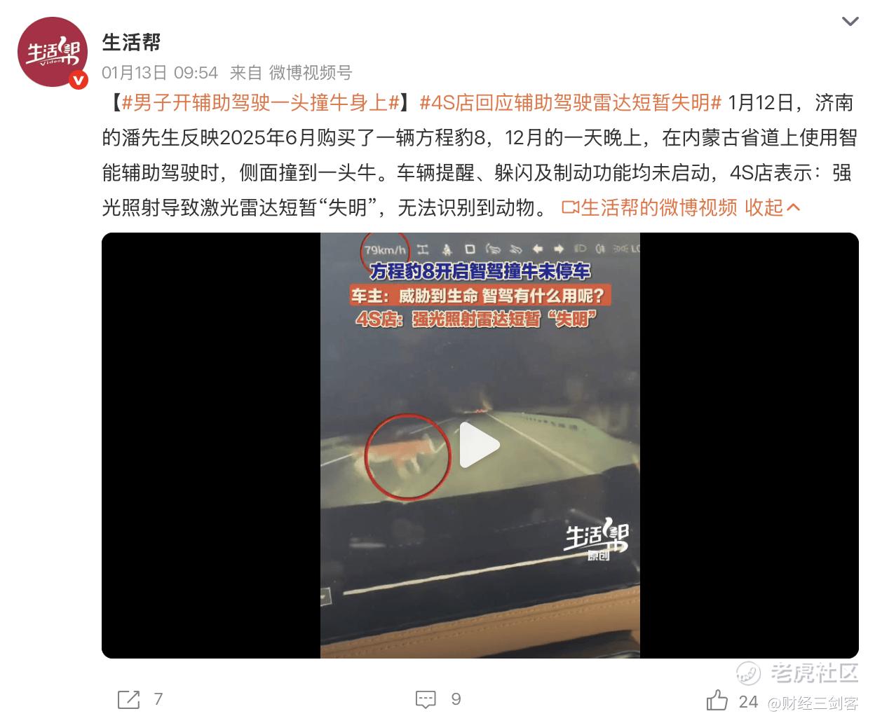 $比亚迪(002594)$ 【文/深度评车&财经三剑客】1月12日,济南的潘先生反映2025年6月购买了一辆方程豹豹8,12月在内蒙古使用智能辅助驾驶时,侧面撞到牛身上。车辆提醒、躲闪及制动功能都没有启动,4S店表示:强光照射激光雷达导致短暂“失明”,动物识别不出来。