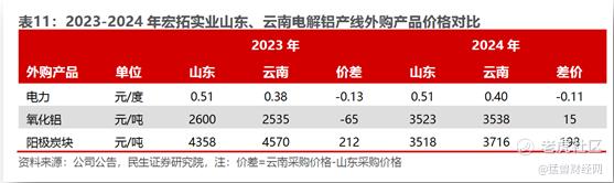 值得一提的是,宏创控股子公司宏拓实业早在2024年便制定了未来三年的产能转移计划,至2027年末公司云南电解铝产能将扩张至300.8万吨。从宏拓实业山东、云南电解铝基地外购原料及能源价格来看,两地区预焙阳极采购成本差异不大,但2023-2024年云南电价分别为0.38、0.40 元,而山东电价均为0.51元,对比之下云南水电价格优势明显。窥斑见豹,随着产能向云南转移,后续宏创控股的电力成本料将会持续下降,进而进一步增厚电解铝利润。