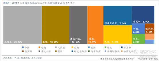 从上游说起,众所周知铝是地球上储量最丰富的金属元素,以铝土矿的形式存在。其中,几内亚拥有世界上最大的铝土矿储量,约为74亿吨,占世界总储量的25.52%左右;作为对比,中国的铝土矿储量较低,只有不到3%。
