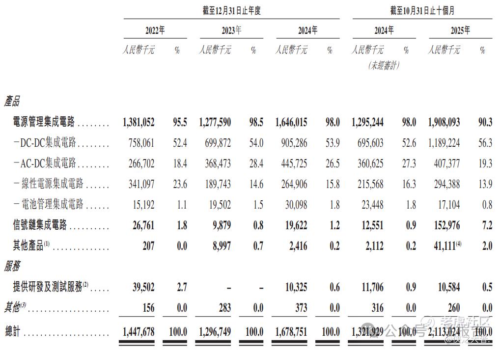 公司拥有涵盖工艺、集成电路设计和系统定义在内的完整核心技术架构。公司专注于提供创新、高效、可靠的模拟集成电路产品,同时为客户实现价值最大化。于往绩记录期间,公司的产品组合主要包括电源管理集成电路及信号链集成电路。公司凭借在多个产品类别的设计与开发能力,提供多样化的电源管理集成电路产品。