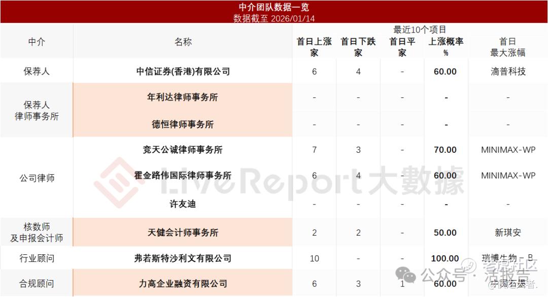 据**大数据统计,杰华特中介团队共计9家,其中保荐人1家,近10家保荐项目数据表现有待提升;公司律师共计3家,综合项目数据表现普通。整体而言中介团队历史数据表现中规中矩。