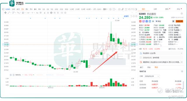 数据显示,钧达股份A股股价自2025年12月12日以来涨势凌厉,截至2026年1月19日14时飙升逾148%,期间多次斩获涨停板;同期,钧达股份H股亦累涨逾57%,表现不俗。