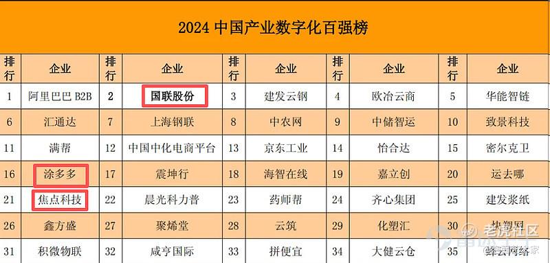 近期焦点科技涨的火热,看评论区有人把这份《2024 中国产业数字化百强榜》给扒了出来,在该榜中国联股份排名第二,国联子公司涂多多排名第十六,焦点科技排名第二十一,分享上来给大家简单做个参考吧。