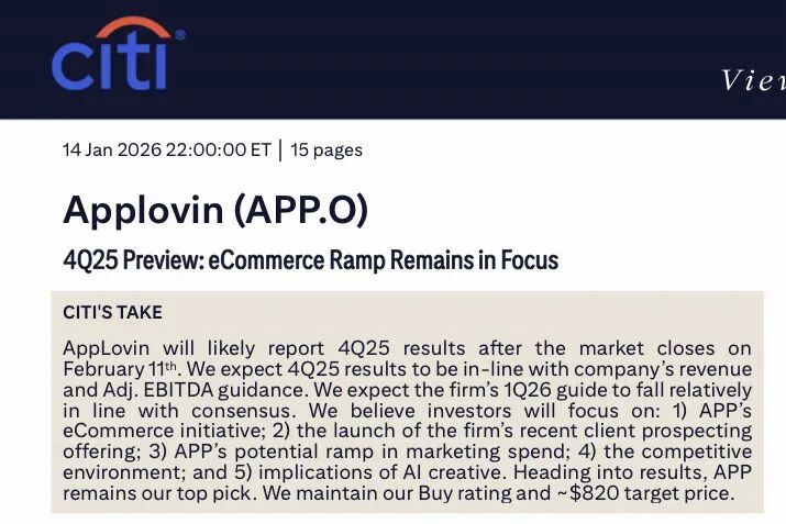 花旗银行1月14日发布AppLovin 4Q25业绩前瞻研报,维持买入评级与820美元目标价。值得关注的是,当前做空比例高达7.0%,但花旗仍将APP列为其首选标的。