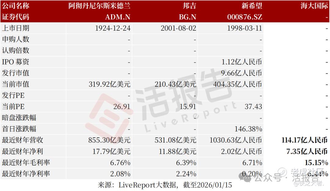 同行业IPO可比公司:Archer Daniels Midland Company(ADM.N)、邦吉(BG.N)、新希望(000876.SZ)