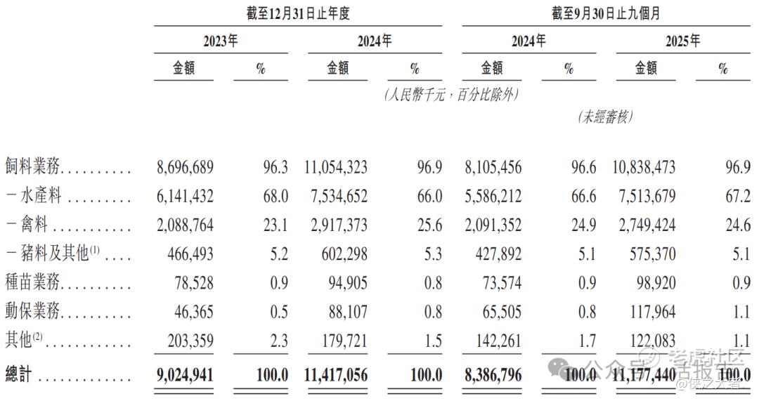 公司收入主要来自农业相关产品销售及配套服务,重大部分来自饲料业务,2023年和2024年该业务收入占总营收比例分别达96.3%和96.9%,其中水产料是核心收入支柱,2023年和2024年占比分别为68.0%和66.0%;种苗业务和动保业务收入占比相对较小,2024年分别为0.8%和0.8%;多余原料销售等其他业务获得的收入比例最小,2023年和2024年占比分别为2.3%和1.5%,属于补充性收入来源。