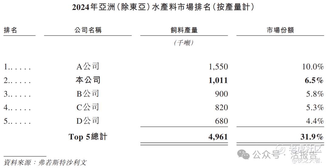 2024年,亚洲(不含东亚)水产料市场相对分散。其中,公司2024年实现水产料总产量1011千吨,按产量计,在亚洲(不含东亚)水产料市场中排名第二。