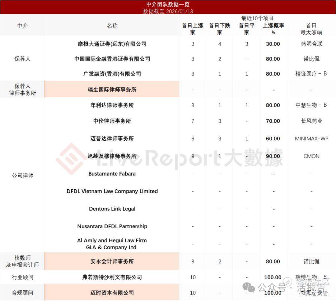 据**大数据统计,海大国际中介团队共计16家,其中保荐人3家,近10家保荐项目数据表现普通;公司律师共计9家,综合项目数据表现尚可。整体而言中介团队历史数据表现稳妥。